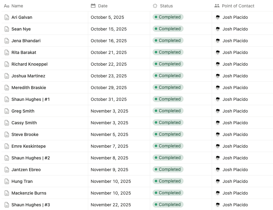 FIG 04. A snapshot of some of the 25+ user interviews I led — covering product validation, feature iteration and workflow optimization.