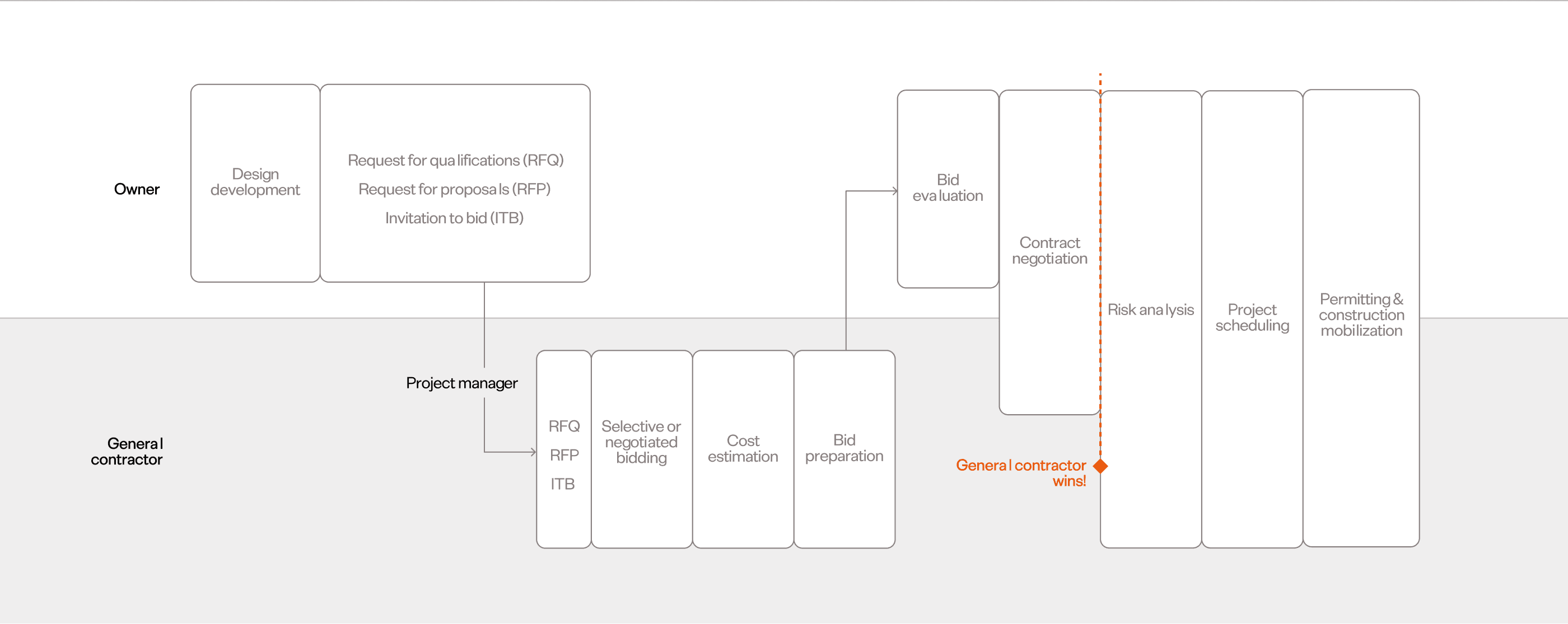 FIG 01. A high-level preconstruction timeline of a building owner/general contractor relationship, with the project manager in between.